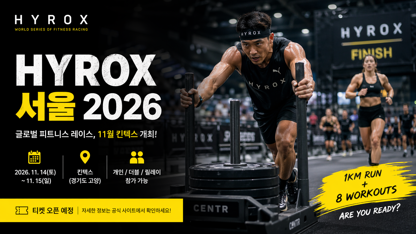HYROX 서울 대회가 2026년 11월 킨텍스에서 개최됩니다. 러닝과 기능성 운동이 결합된 글로벌 피트니스 레이스입니다.